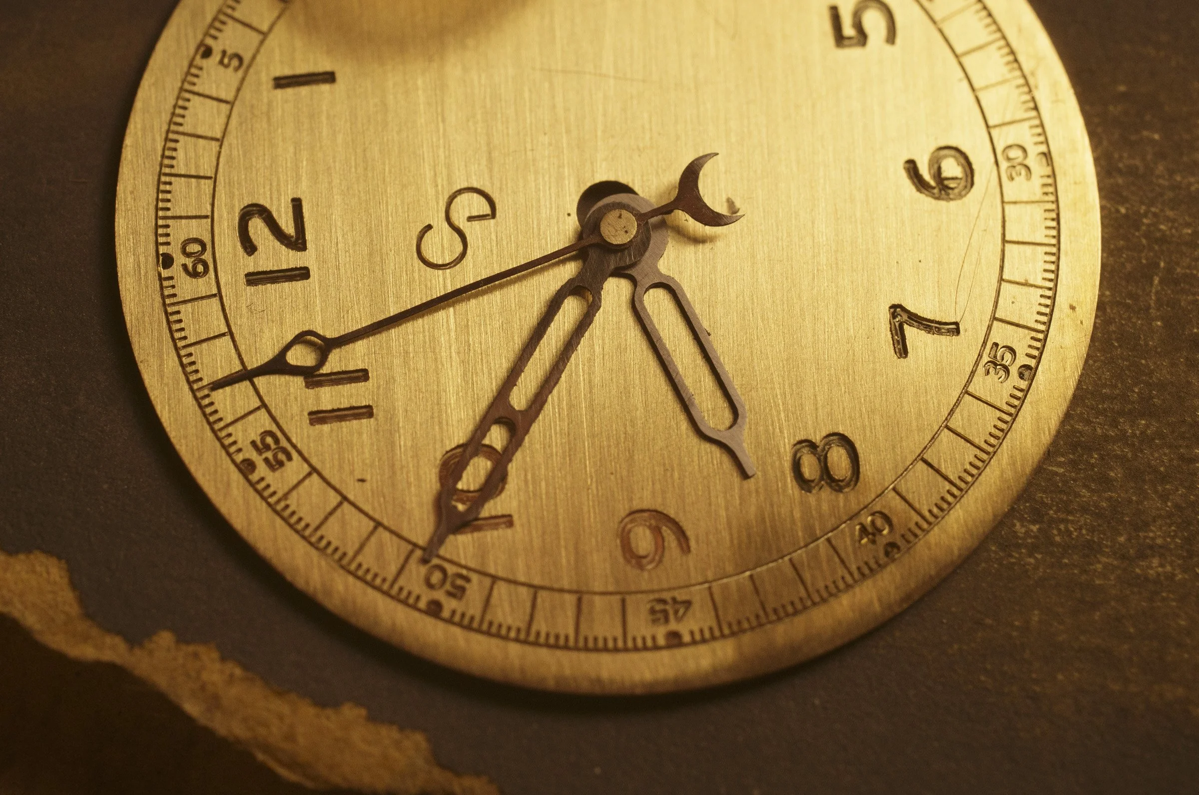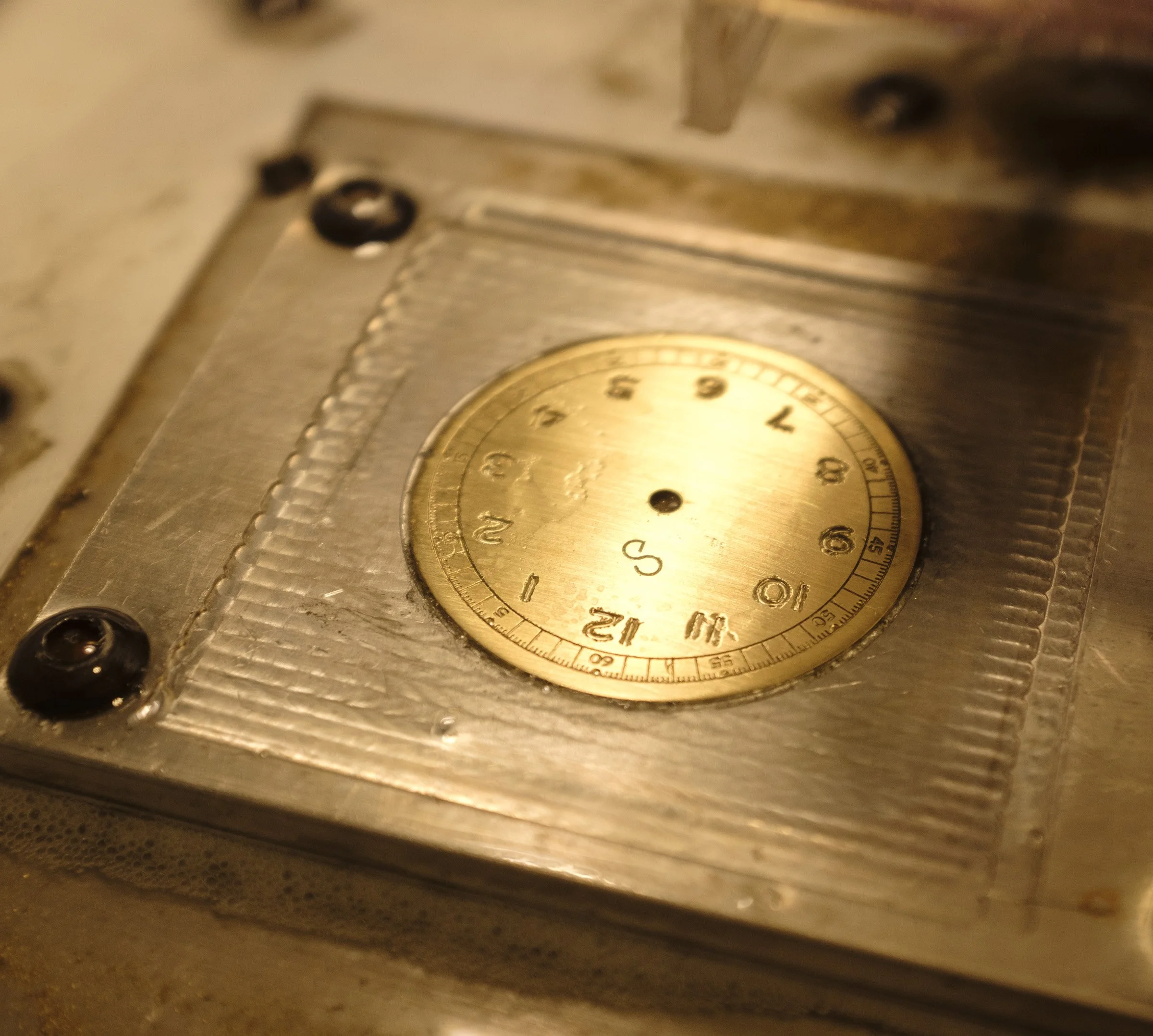 An early dial prototype with a paint fill in the dial markings and a worn oxide finish. The final version will have larger hour markers which will be lume filled. The color will also be a more muted and darker gray.